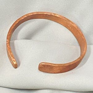 Bransoleta wykonana z miedzianej blachy, typu otwartego z fakturą wykonaną techniką młotkowania. Wymiary produktu: szer. 30 mm, średnica 70 mm.