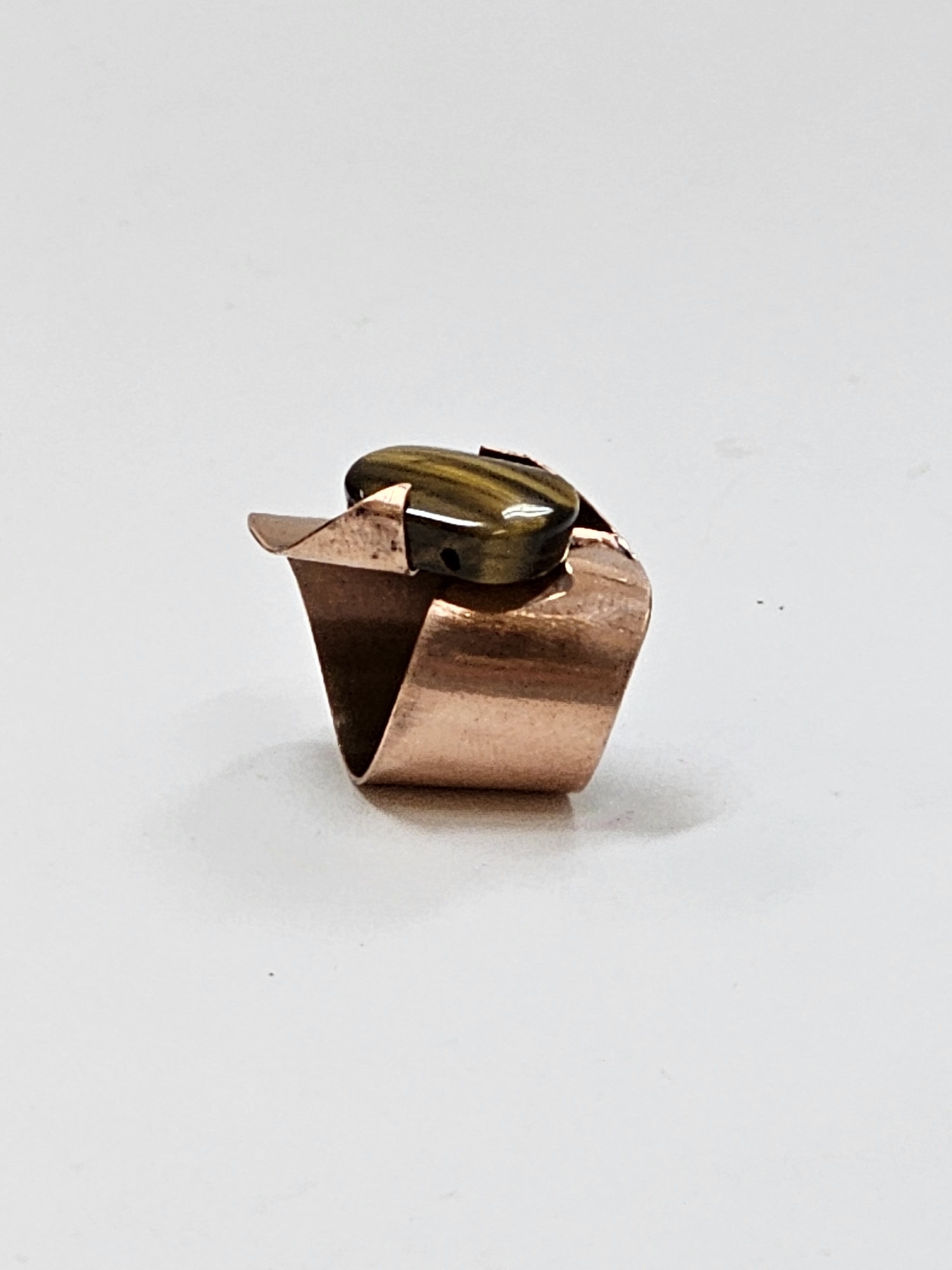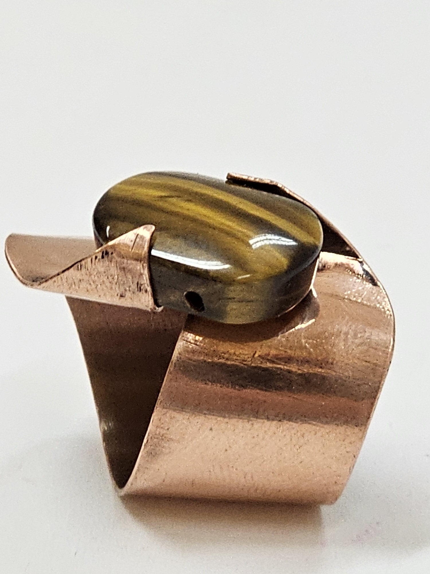 Produkt wykonany z blachy miedzianej bez faktury, ozdobiony naturalnym kamieniem ” Tygrysie oko”. Wymiary produktu śr.19 mm, szer. 29 mm. Produkt autorski do nabycia wyłącznie w naszym sklepie.,