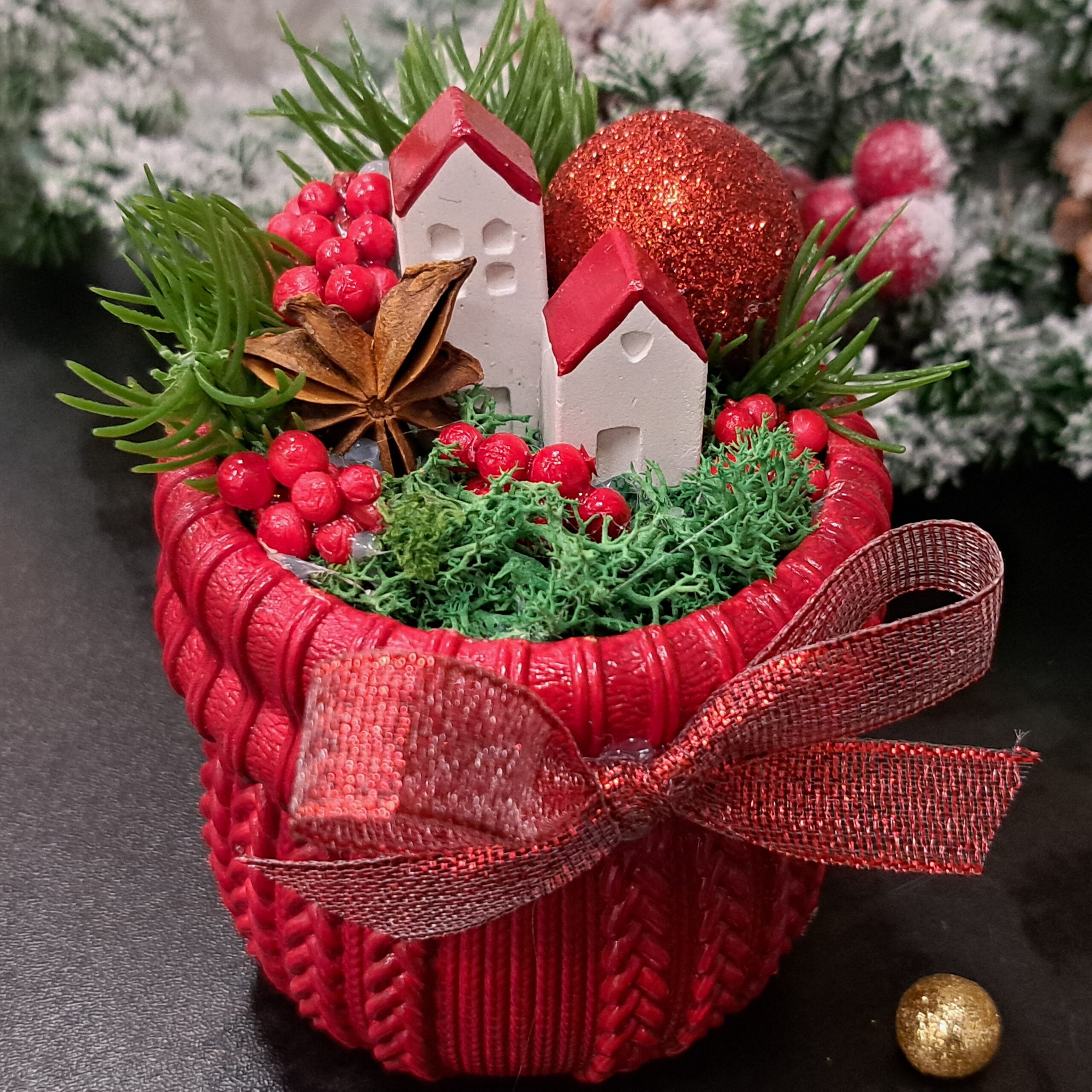 Niewielkich rozmiarów stroik będzie doskonałym uzupełnieniem świątecznych dekoracji w każdym domu. Jego podstawa została ozdobiona subtelnym motywem swetra, który nadaje całości ciepłego, przytulnego charakteru. Stroik utrzymany w odcieniach ciemnej czerwieni i złota.