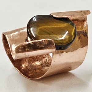 Pierścionek wykonany z miedzianej blachy z fakturą, ozdobiony naturalnym kamieniem " Tygrysie oko". Wymiary produktu: śr. 19 mm, szer. 29 mm. Autorski produkt biżuteryjny do nabycia tylko w naszym sklepie.