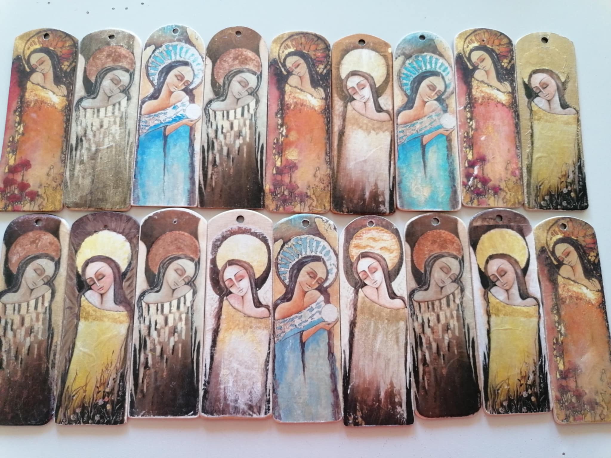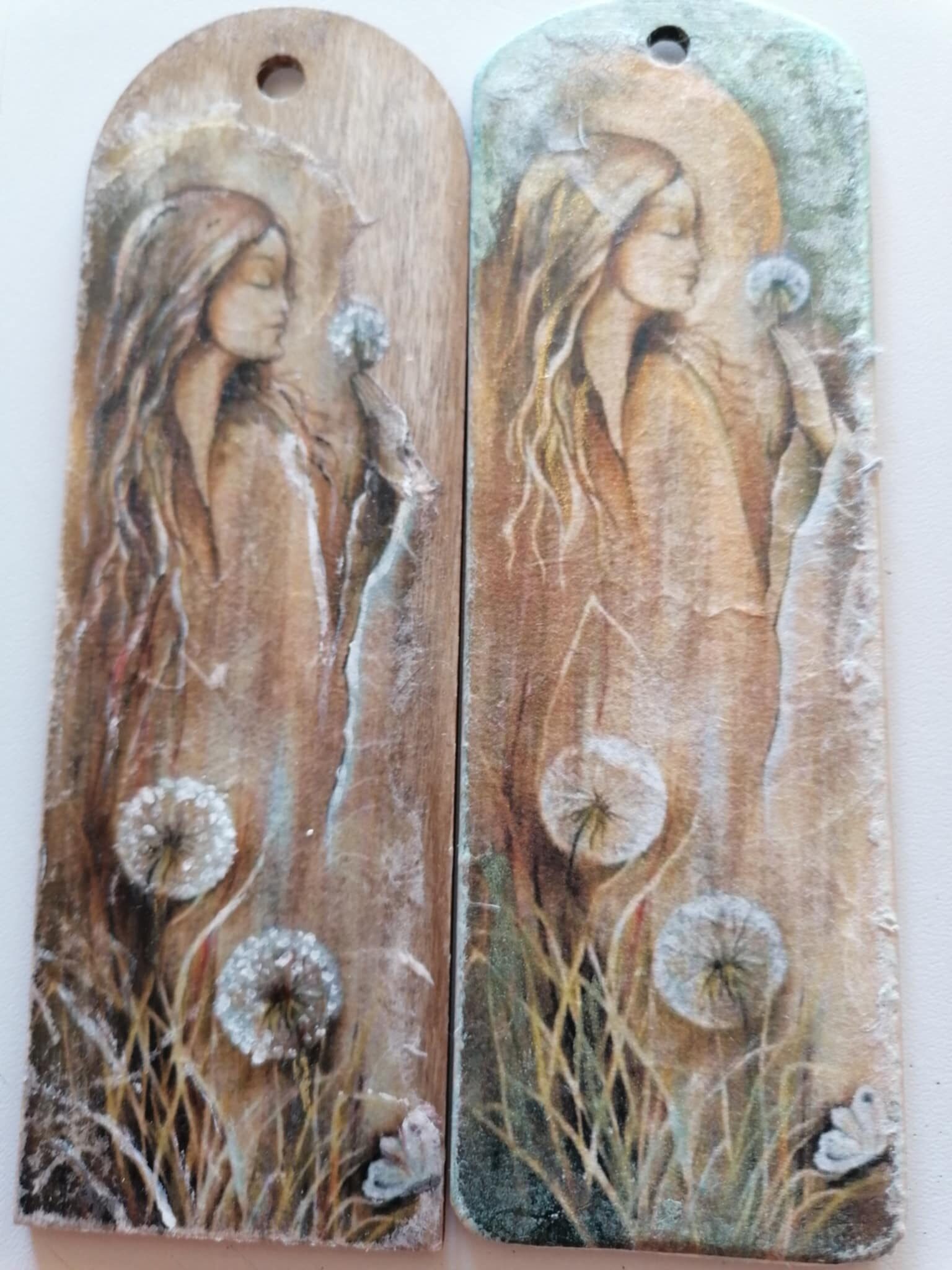 Materiały: drewno/sklejka, transfer, decoupage, woski pszczele, złocenia (szlagmetal), akwarela transparentna, lakier połysk