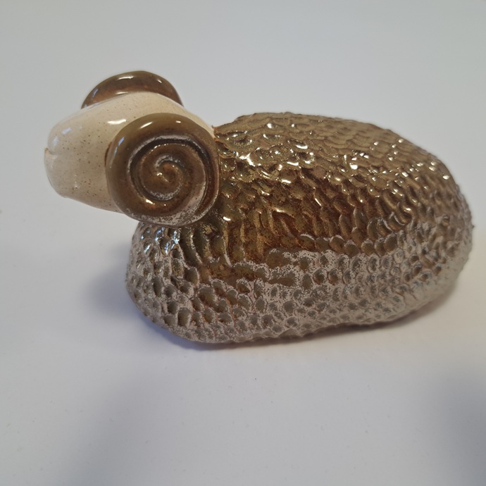 Elegancki złoty baran wielkanocny wykonany z gliny to wyjątkowa dekoracja, która wprowadzi do Twojego domu atmosferę świątecznej tradycji. Starannie uformowany i ręcznie wykończony, zachwyca subtelnymi detalami oraz szlachetnym, złotym połyskiem, który pięknie odbija światło.