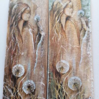 Materiały: drewno/sklejka, transfer, decoupage, woski pszczele, złocenia (szlagmetal), akwarela transparentna, lakier połysk