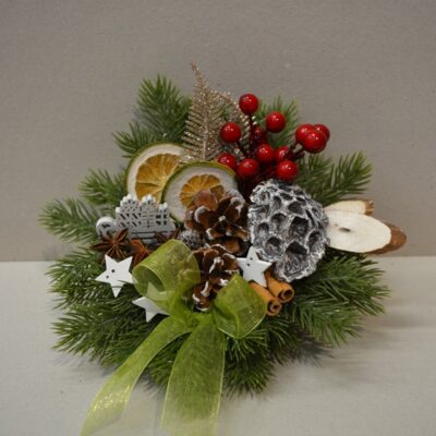 Stroik bożonarodzeniowy stojący, wykonany na bazie koszyczka z wikliny papierowej. Do wykonania stroika, poza koszyczkiem użyto sztucznych dodatków takich jak: świerkowe igliwie, szklaną bombkę, szyszkę świerkową, owoc dzikiej róży, owoc ostrokrzewu, sztuczny śnieg, kokardę wykonaną z dekoracyjnej wstążki oraz kwiat gwiazdy betlejemskiej. Wym. produktu: wys. 19 cm, szer. 15 cm.