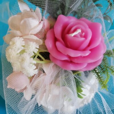 Materiały: doniczka gipsowa lakierowana, tiul, sztuczne kwiaty, świeczka, pianka florystyczna sucha