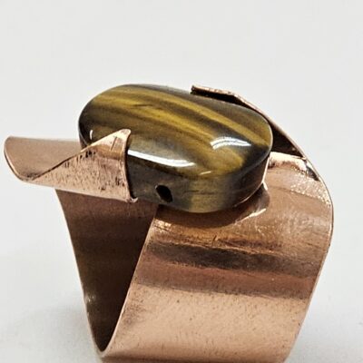 Produkt wykonany z blachy miedzianej bez faktury, ozdobiony naturalnym kamieniem " Tygrysie oko". Wymiary produktu śr.19 mm, szer. 29 mm. Produkt autorski do nabycia wyłącznie w naszym sklepie.,